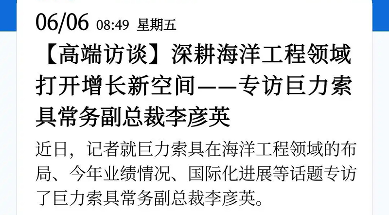 6月6日,新華社發(fā)布了一篇題為《深耕海洋工程領(lǐng)域 打開增長新空間——專訪巨力索具常務(wù)副總裁李彥英》的報道,對巨力索具深耕海洋領(lǐng)域進行了深入關(guān)注。