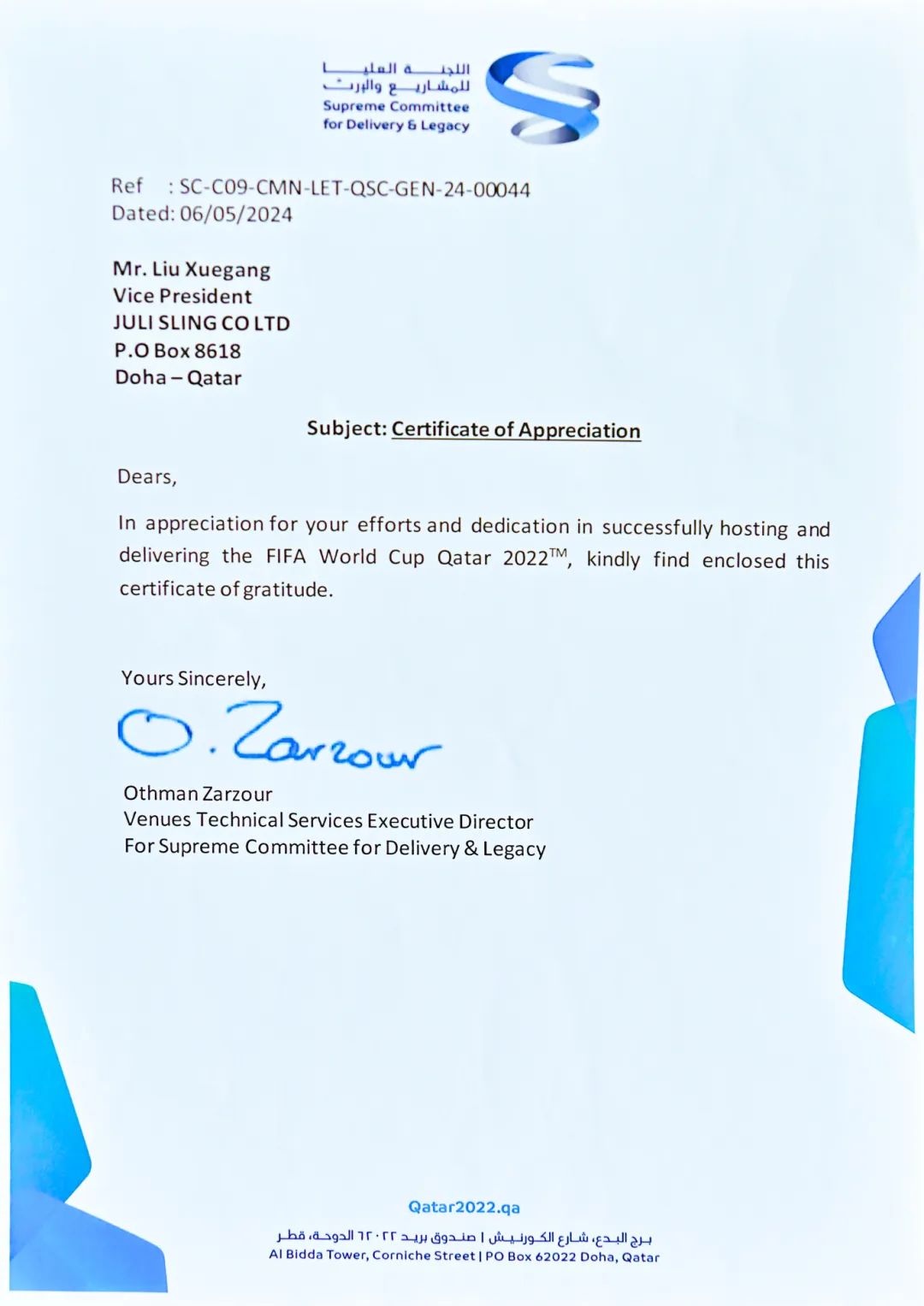 隨著2024年溫暖的春意,我們收到了來自項目業主——卡塔爾交付和遺產最高委員會(SUPREME COMMITTEE FOR DELIVERY & LEGACY)的感謝信及認可證書,這是對我們過往努力的最佳肯定。信中的每一個字句,都是對我們團隊辛勤工作和不懈努力的高度認可。這份榮耀不僅屬于我們,也屬于每一位支持和關注我們項目的人。您們的信任和支持是我們最寶貴的財富,是我們不斷前進的動力源泉。