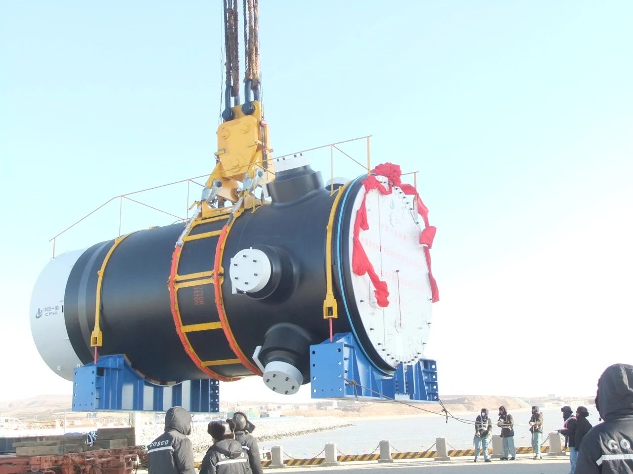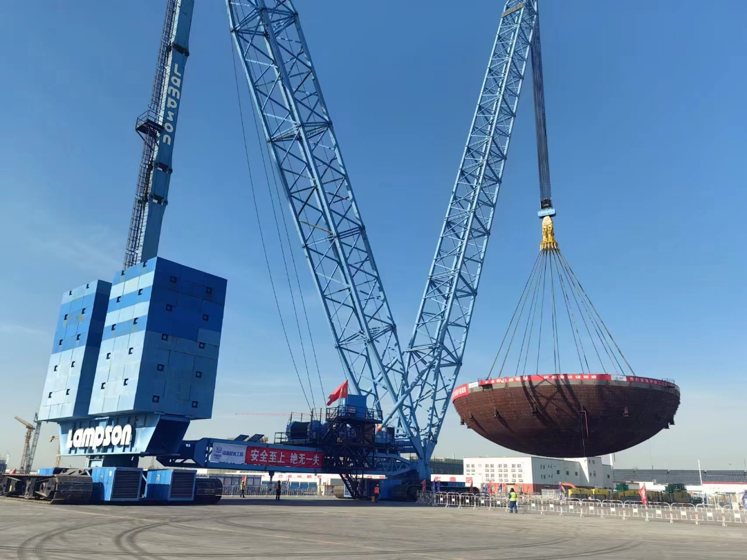 2024年1月,徐大堡核電1號機(jī)組CV底封頭開始吊裝,CV底封頭整體呈半橢球形殼體結(jié)構(gòu),具有重量大、體積大、就位精度高等特點(diǎn)。巨力索具所提供的轉(zhuǎn)接頭、分配器、吊索組成成套吊具解決受力問題,并全程配合吊裝過程,確保吊裝過程穩(wěn)步進(jìn)行。