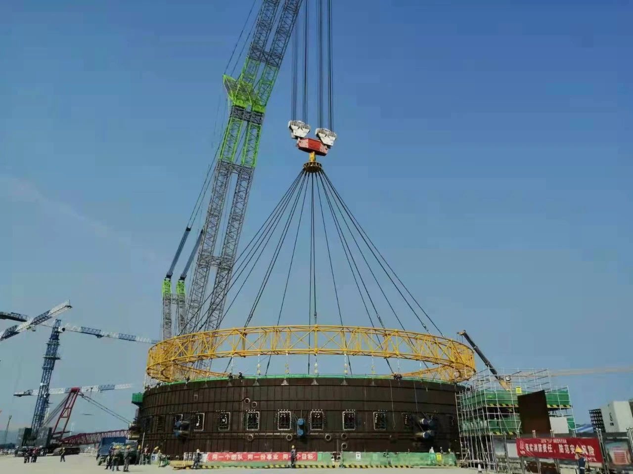 2022年1月,漳州核電2號機(jī)組核島鋼襯里模塊七吊裝成功,巨力索具為該項(xiàng)目提供牛腿模塊環(huán)形吊具、鋼絲繩索具、無接頭繩圈等相關(guān)配套索具,全程保障吊裝環(huán)節(jié)順利進(jìn)行。吊裝過程質(zhì)量安全整體受控,實(shí)現(xiàn)了鋼襯里筒體、牛腿和次鋼平臺一體化模塊施工,標(biāo)志著“華龍一號”鋼襯里模塊化施工又有新突破,開創(chuàng)了國內(nèi)外核電機(jī)組鋼襯里全模塊化施工建造的先河。