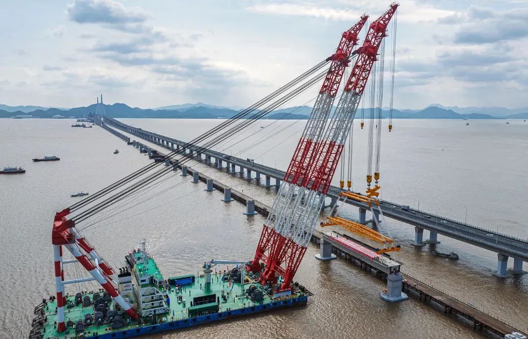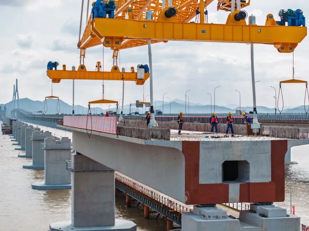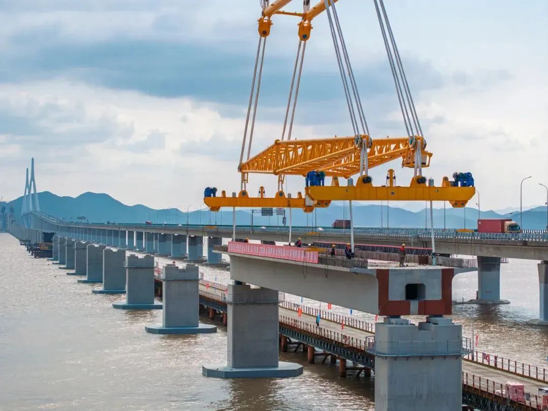 大橋海上架設預制箱梁共66榀,每榀梁長60米,寬10.6米,重約1700噸,吊具重280噸,總體起吊總重1980噸,是國內市域(郊)鐵路工程跨度最大、噸位最重的預應力混凝土預制箱梁。