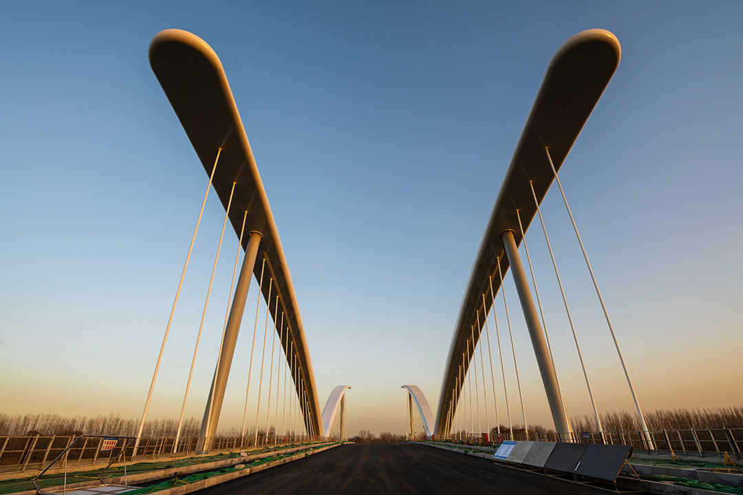 大橋全長259米,造型以鷺鷥涉水時舒展的羽翼為原型,取展翅翱翔,高飛于空的意境,將人文理念融合于雄安灣生態(tài)自然的景觀中。以“展翅高飛”為景觀主題,塑造整體協(xié)調(diào)、重點突出的夜間燈光效果,營造“清新、亮麗、現(xiàn)代、雅致“的夜間橋梁景觀形象。橋梁全線有功能照明和可分級控制的景觀照明,為平日和節(jié)日提供不同的照明效果。