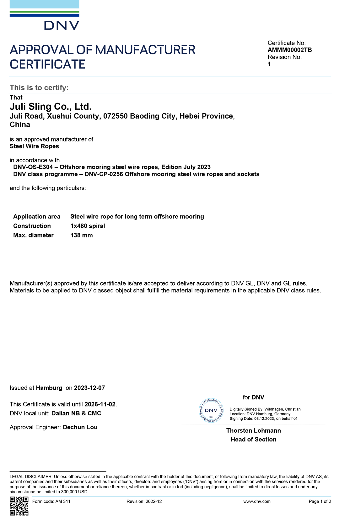 2023年9月,巨力索具持續發力,材料與工藝雙突破,正式通過“DNV長期系泊鋼絲繩接頭及纜繩套環鍛件工廠認可證書”,標志著巨力索具深海系泊裝備的核心部件制造能力達到國際頂尖水平。