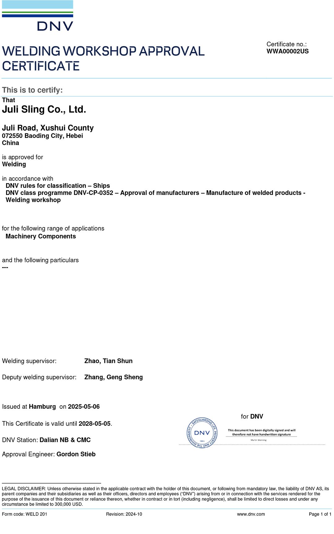 近日,巨力索具股份有限公司通過挪威船級社(DNV)嚴苛審核,正式斬獲DNV焊接工廠認可證書!這是巨力索具在高端制造領域贏得的又一國際權威認可。