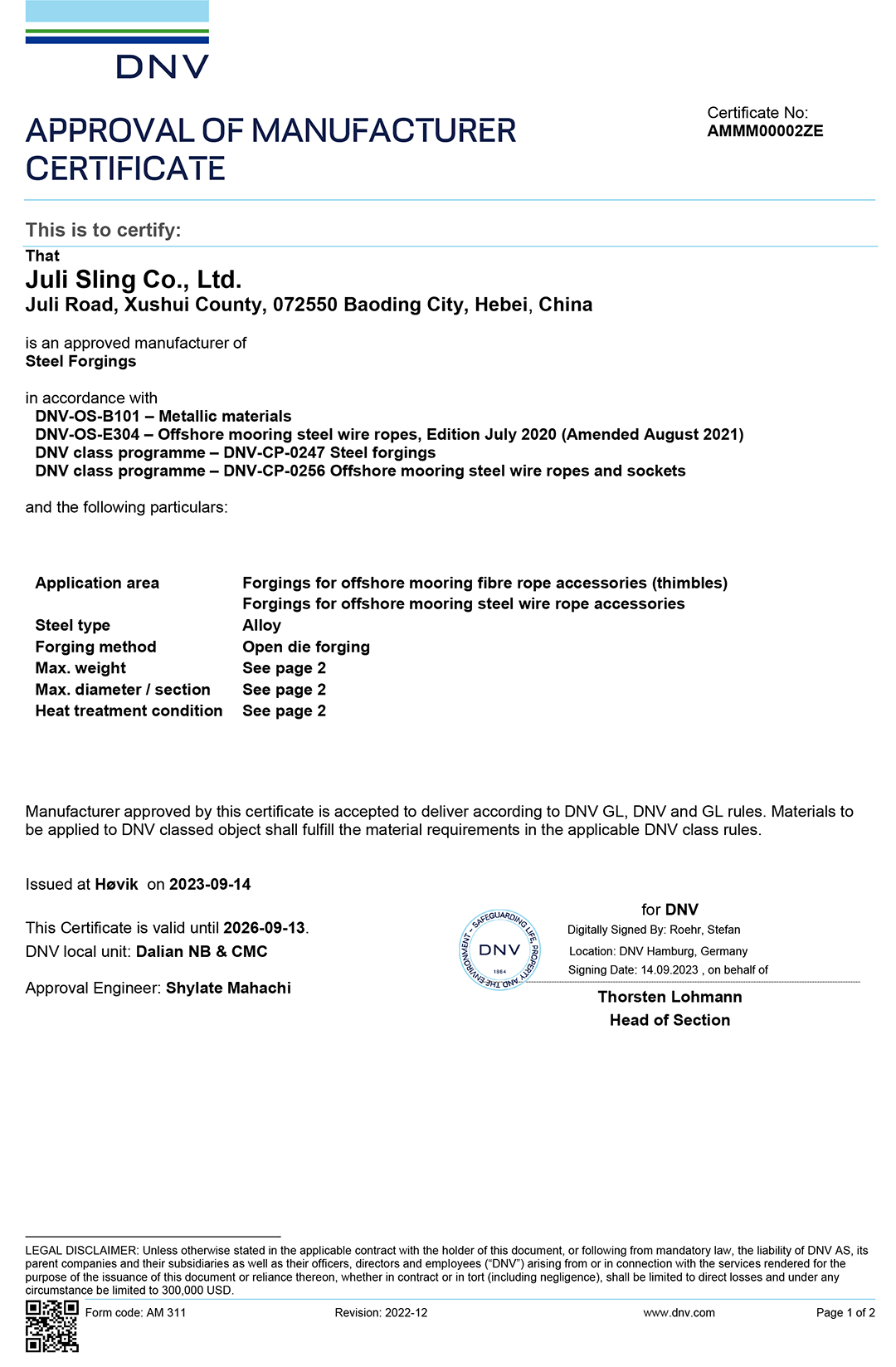 DNV長期系泊鋼絲繩接頭及纜繩套環鍛件工廠認可證書
