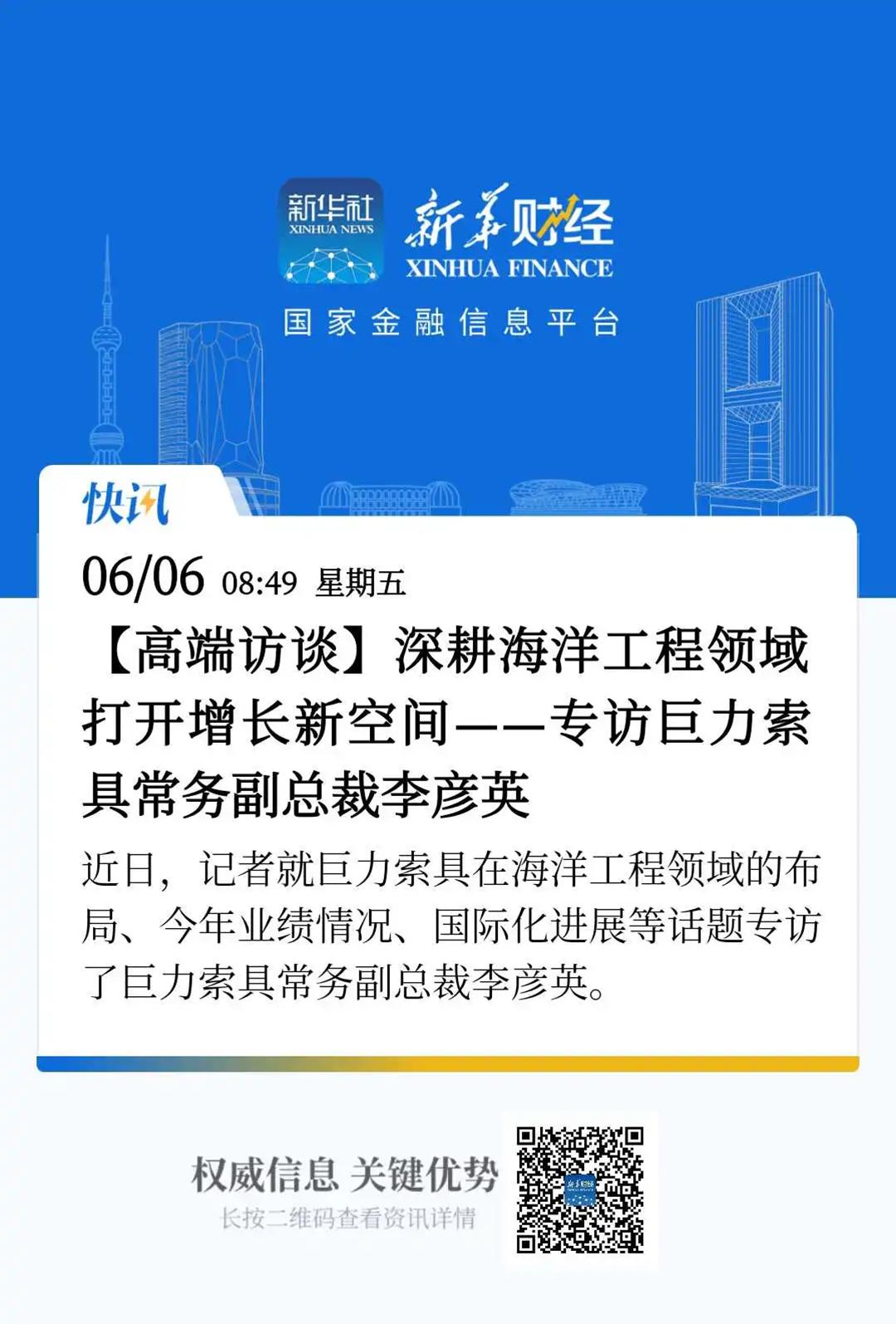 6月6日,新華社發布了一篇題為《深耕海洋工程領域 打開增長新空間——專訪巨力索具常務副總裁李彥英》的報道,對巨力索具深耕海洋領域進行了深入關注。