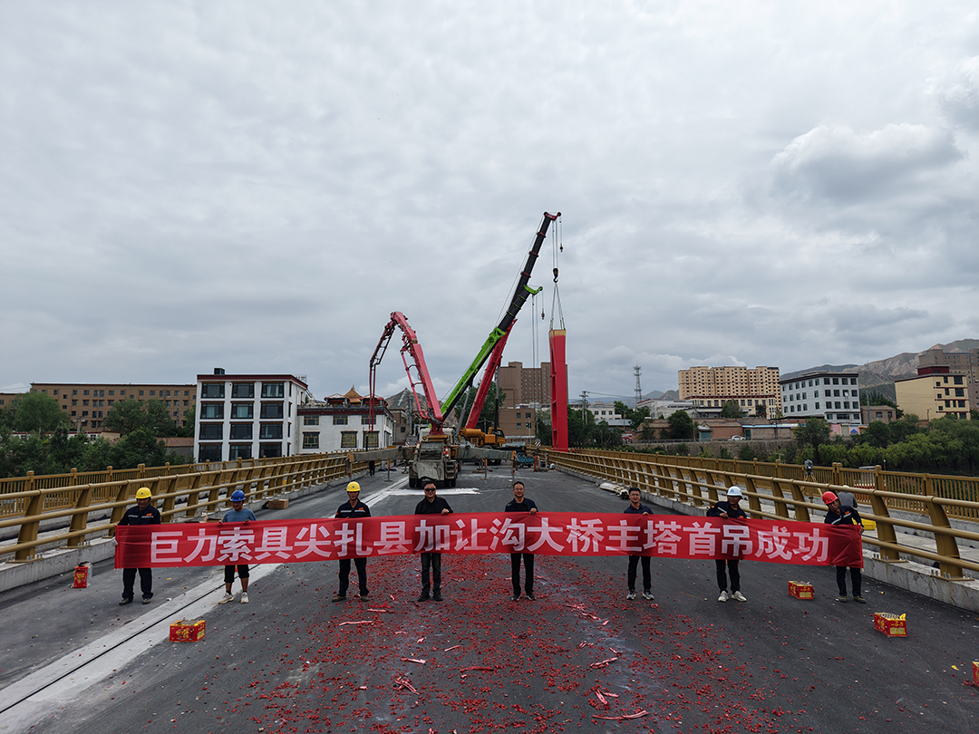 【巨力工程】尖扎縣加讓溝大橋主塔首吊成功