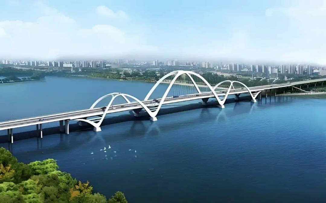 主橋橋型為五跨飛燕式中承鋼箱梁提籃拱橋,多拱造型模擬“湘江碧波”的流動(dòng)形態(tài),平直梁面則寓意河流靜態(tài)水面,一動(dòng)一靜相結(jié)合的簡(jiǎn)潔立體造型彰顯著工程智慧。
