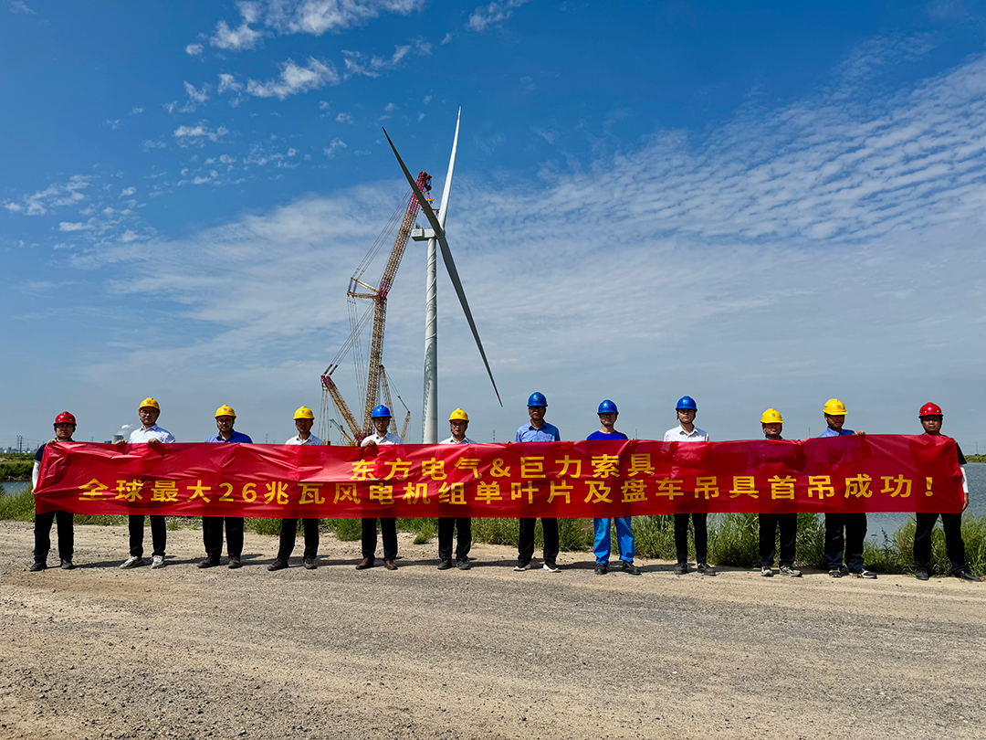 8月29日,由巨力索具股份有限公司為東方電氣風電股份有限公司專項研制的26MW海上風電機組用大噸位單葉片吊具及大扭矩盤車系統,已于山東東營風電裝備測試認證創新基地成功完成吊裝作業。這是目前國內外最大兆瓦海上風電機組葉片吊裝的優異解決方案,創新型解決了最大葉片的吊裝難題。