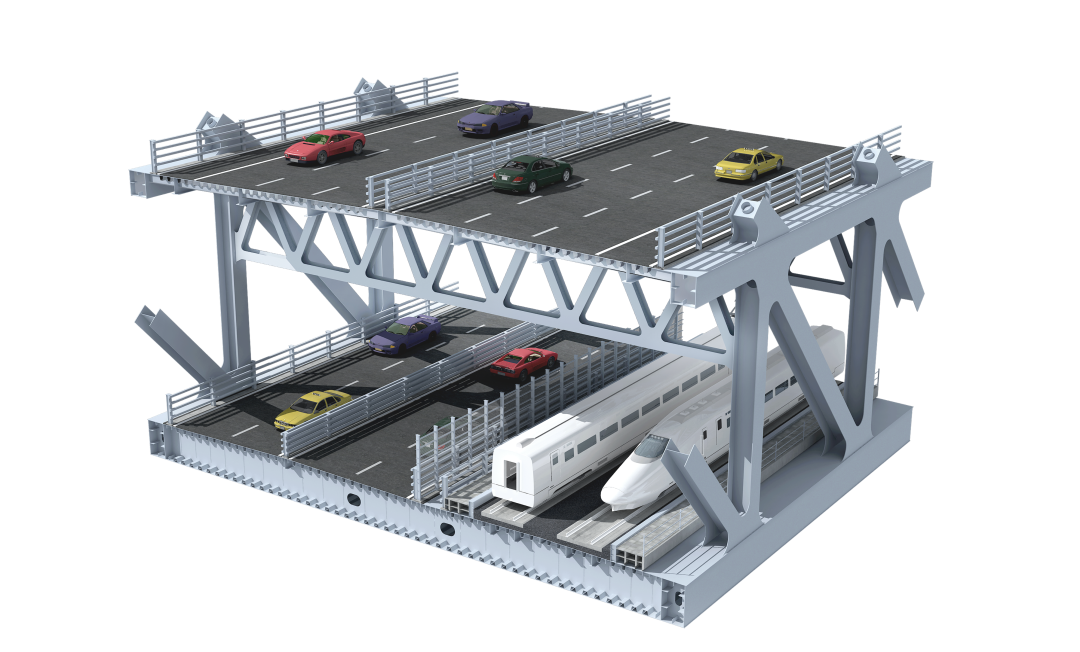 大橋主航道橋鋼梁采用雙主桁“N”形鋼桁梁,桁高15.5米,桁中心間距35米,主橋鋼梁在工廠內整節段制造、運輸,全橋共91個大節段,節段長度14米~28米,節段重量900噸~1856噸。