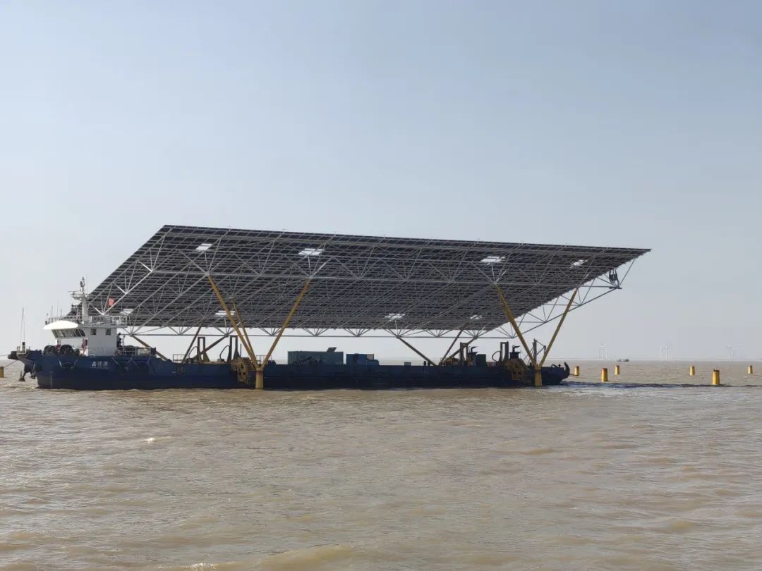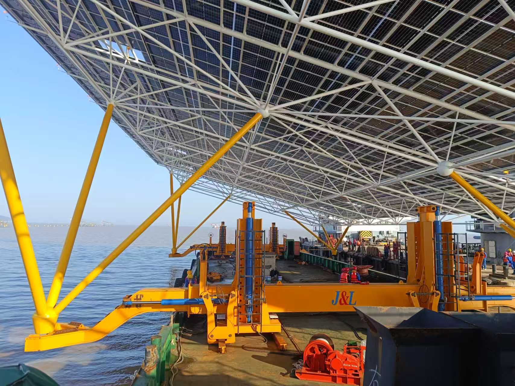 海上光伏整體結構浮托運輸調節裝備是利用駁船在淺海對光伏組件整體結構進行浮托運輸、安裝的裝備。本裝備通過創新設計舉升系統、伸縮梁等關鍵部件,有效提升了光伏組件整體結構安裝的施工效率、施工穩定性以及安裝精確性,同時解決了安裝空間受限等問題。為海上光伏組件提供了一套可在從運輸到安裝的整體解決方案,降低了浮吊船的使用頻率,降低海上光伏運輸和安裝的成本,提升了海上光伏的安裝效率,有效推動了整個產業鏈的技術升級。