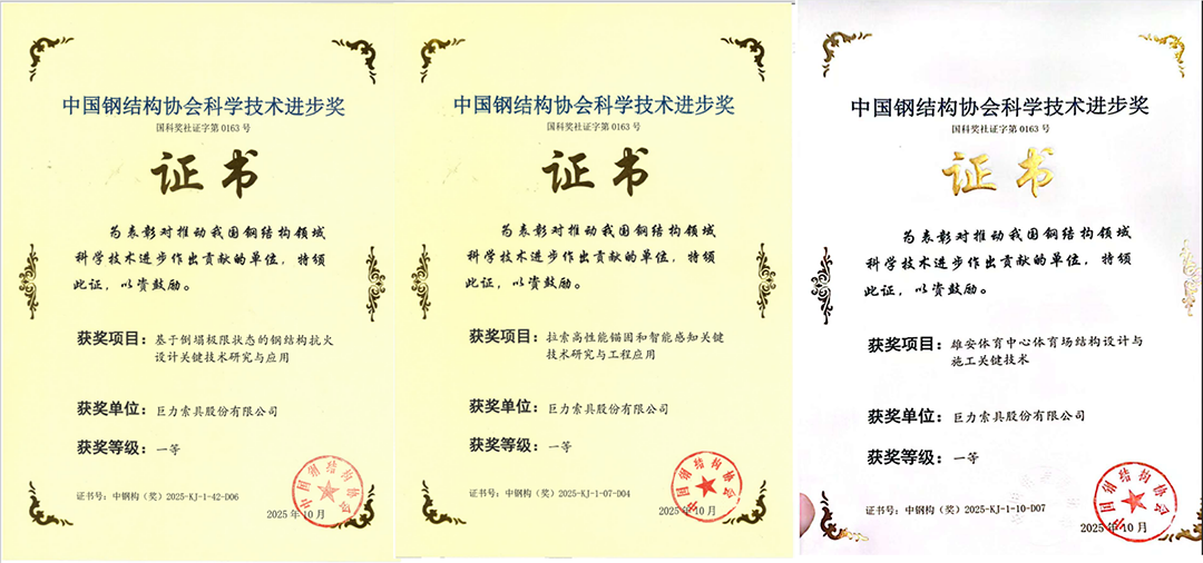 近日,2025年度中國鋼結構協會科學技術進步獎評審結果揭曉。在10月14日于廣西南寧舉行的頒獎典禮上,巨力索具股份有限公司憑借卓越的技術研發實力,一舉斬獲三項一等獎,充分彰顯了公司在高端索具技術領域的創新引領地位。