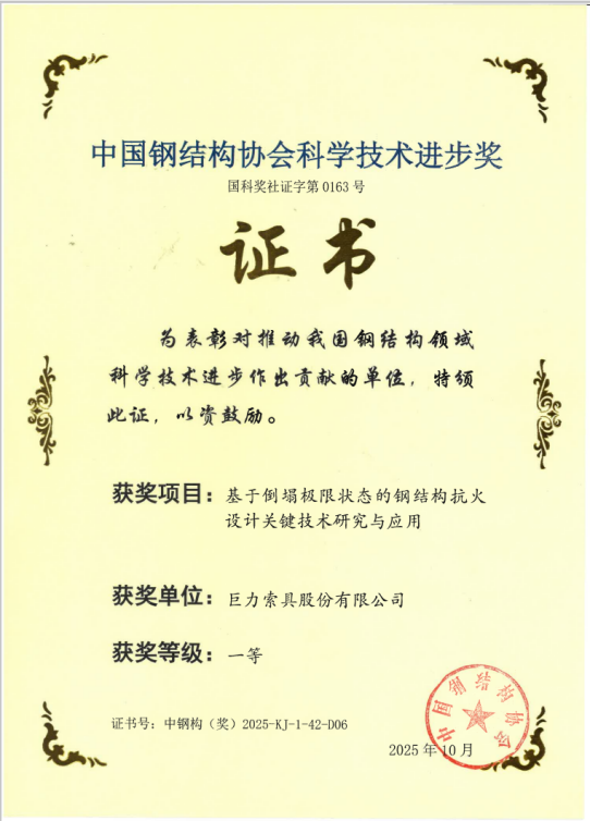 技術創新再獲權威認可!巨力索具榮膺三項中國鋼結構協會科學技術進步獎一等獎