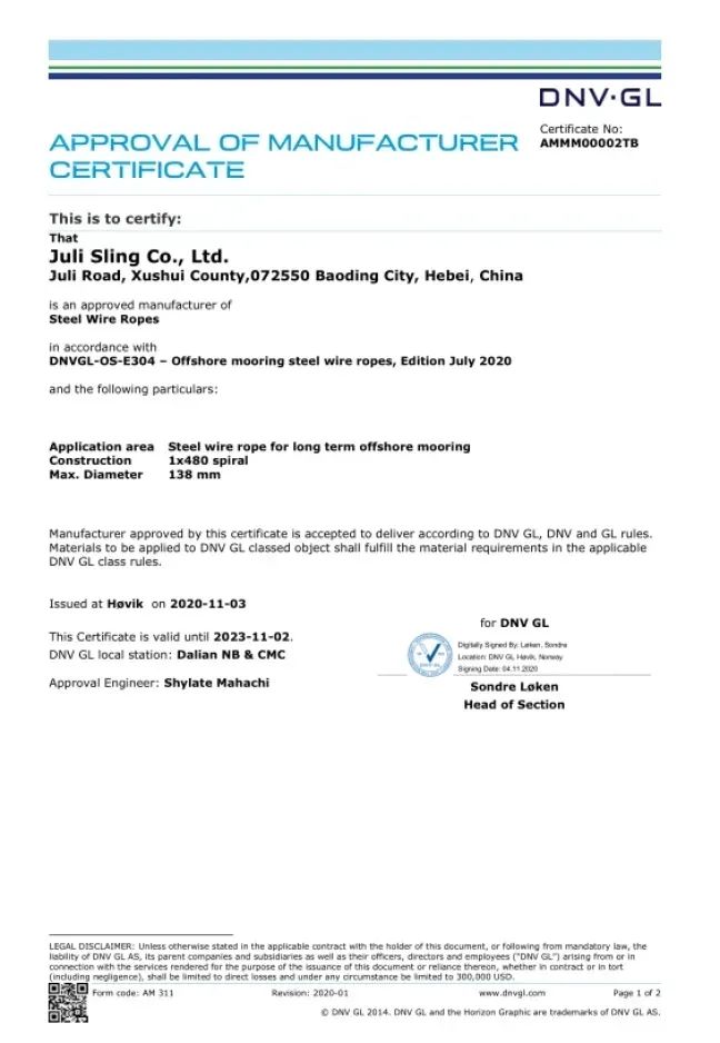 2020年11月,巨力索具取得了永久系泊用單股涂塑鋼絲繩的DNV·GL工廠認可證書,成為國內(nèi)首家通過該類鋼絲繩DNV·GL工廠認可的廠家。