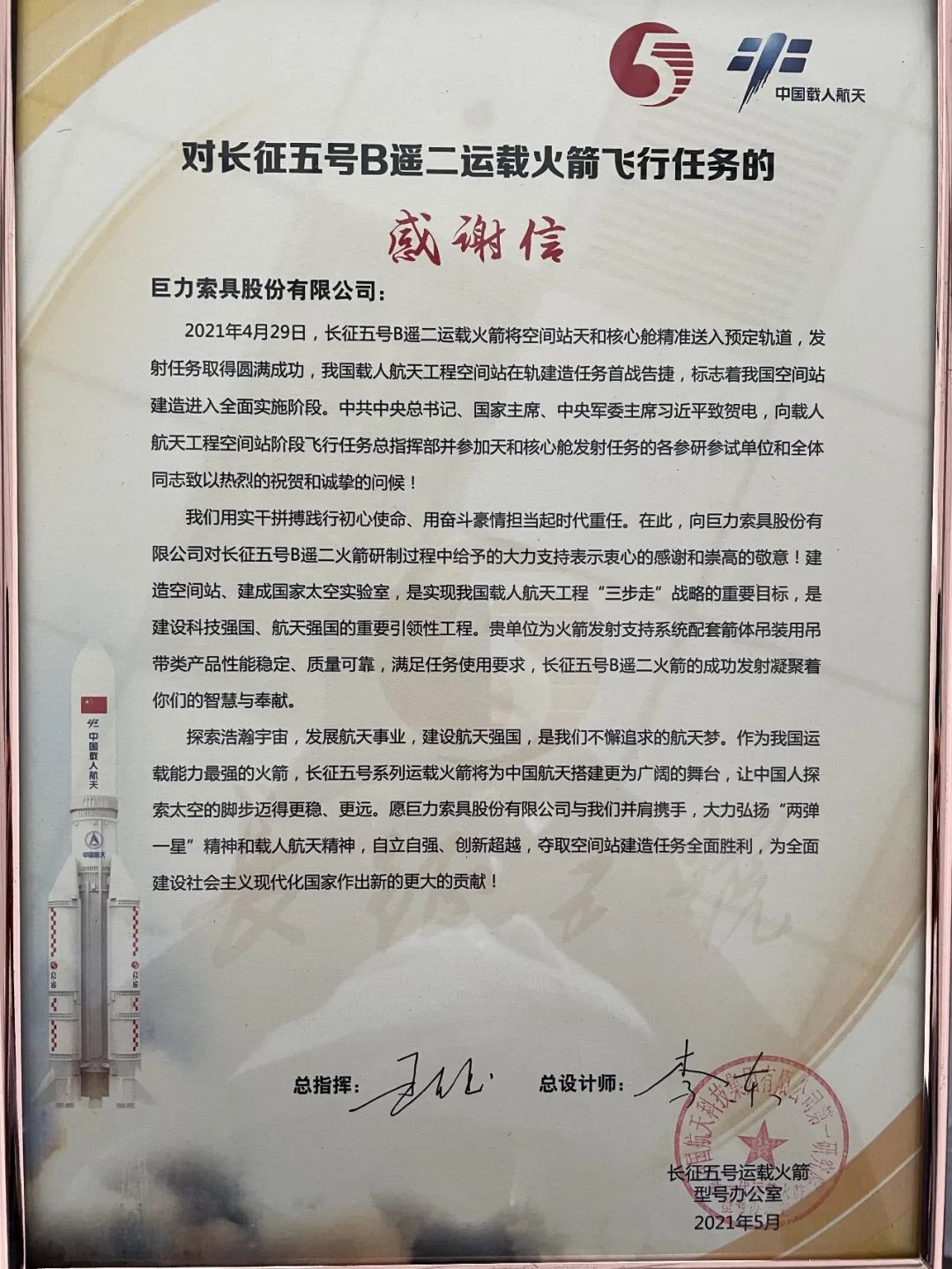 第一研究院在感謝信中向巨力索具對長征五號B遙二火箭研制過程中給予的大力支持表示衷心的感謝和崇高的敬意!巨力索具為火箭發(fā)射支持系統(tǒng)配套箭體吊裝用吊帶類產(chǎn)品性能穩(wěn)定、質(zhì)量可靠,滿足任務(wù)使用要求,長征五號B遙二火箭的成功發(fā)射凝聚著你們的智慧與奉獻(xiàn)。愿巨力索具與我們并肩攜手,大力弘揚(yáng)“兩彈一星”精神和載人航天精神,自立自強(qiáng)、創(chuàng)新超越,奪取空間站建造任務(wù)全面勝利,為全面建設(shè)社會主義現(xiàn)代化國家作出新的更大的貢獻(xiàn)!